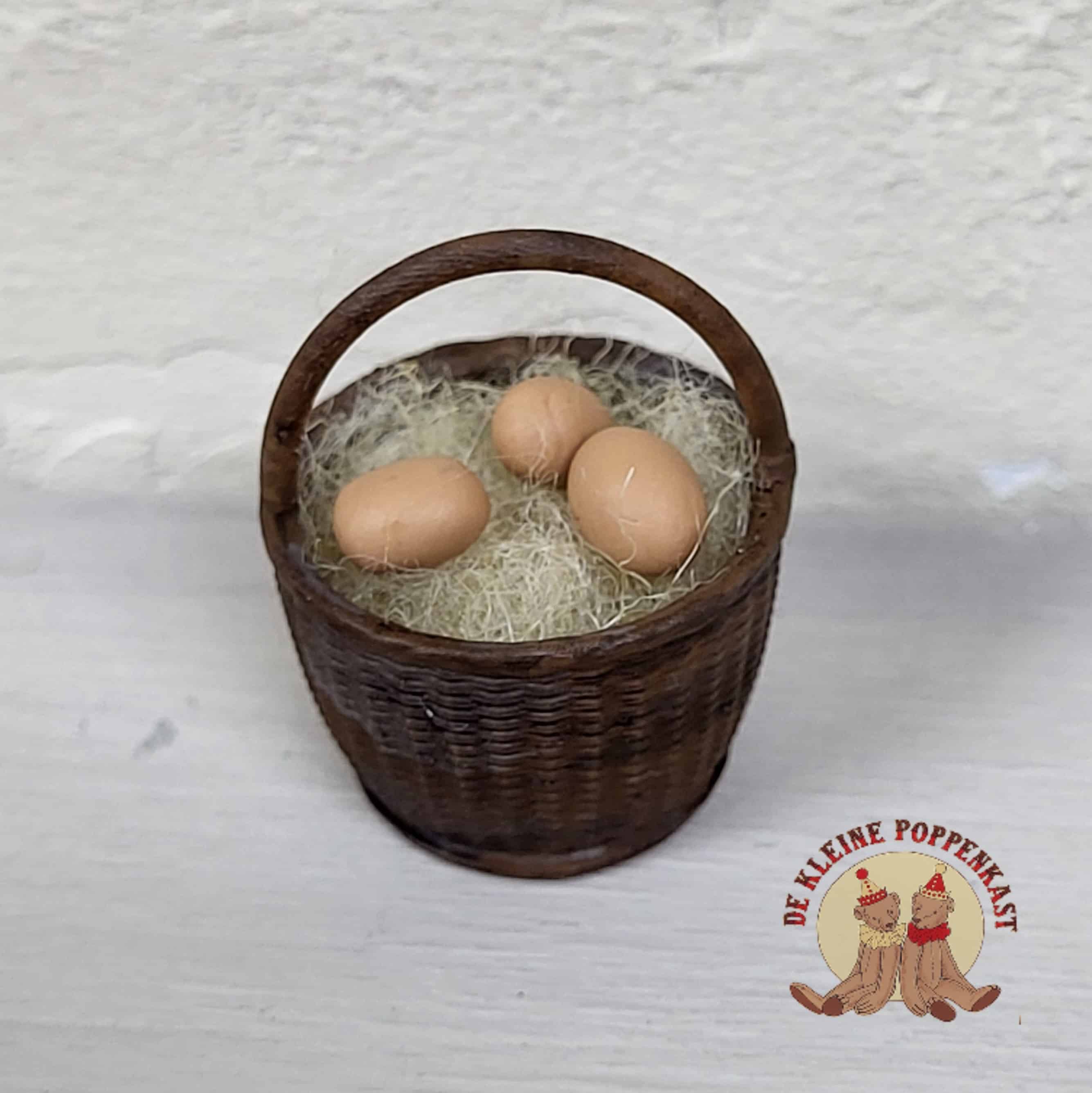 Dit beschilderde mandje is met zorg afgewerkt en gevuld met drie kleine bruine eieren. De natuurlijke tinten en subtiele afwerking geven het mandje een warme, landelijke uitstraling. Het mandje wordt kant-en-klaar geleverd en is direct te gebruiken.