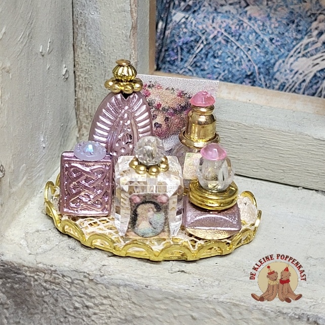 Parfumset roze/lila op goudkleurig dienblaadje – 1:12