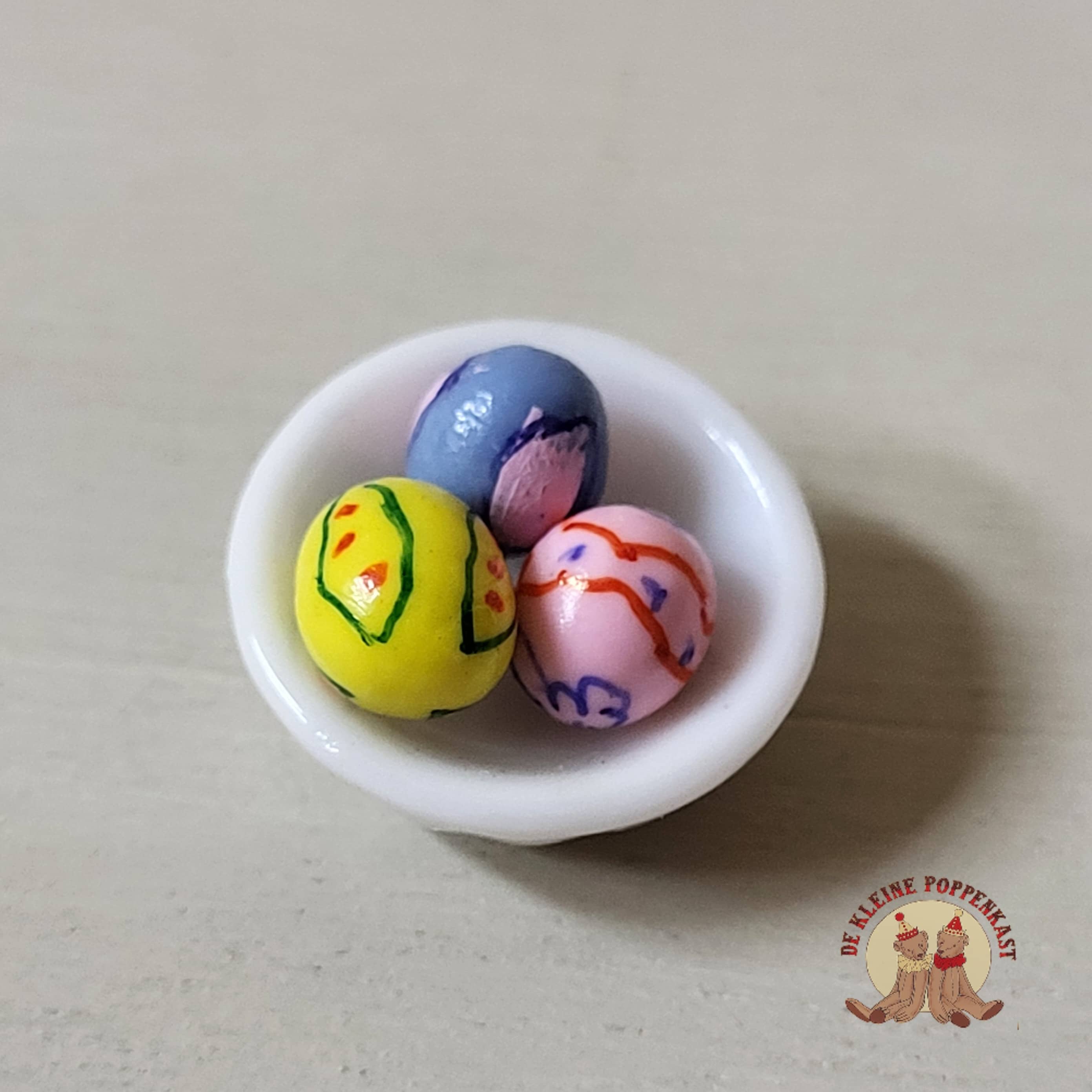 Porseleinen kommetje met drie beschilderde eieren – 1:12