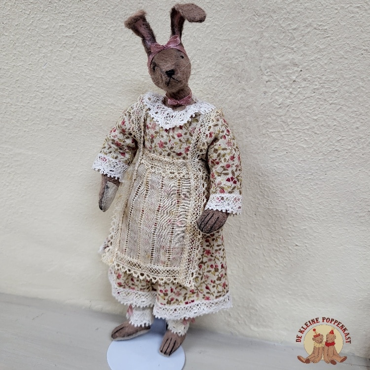 Maak kennis met Rosalie, een handgemaakte haas in formaat van een poppenhuispop, bedoeld als bewoner voor het poppenhuis. Rosalie draagt een fijn jurkje met kanten details en een schort van antiek kant, wat haar een zachte, nostalgische uitstraling geeft