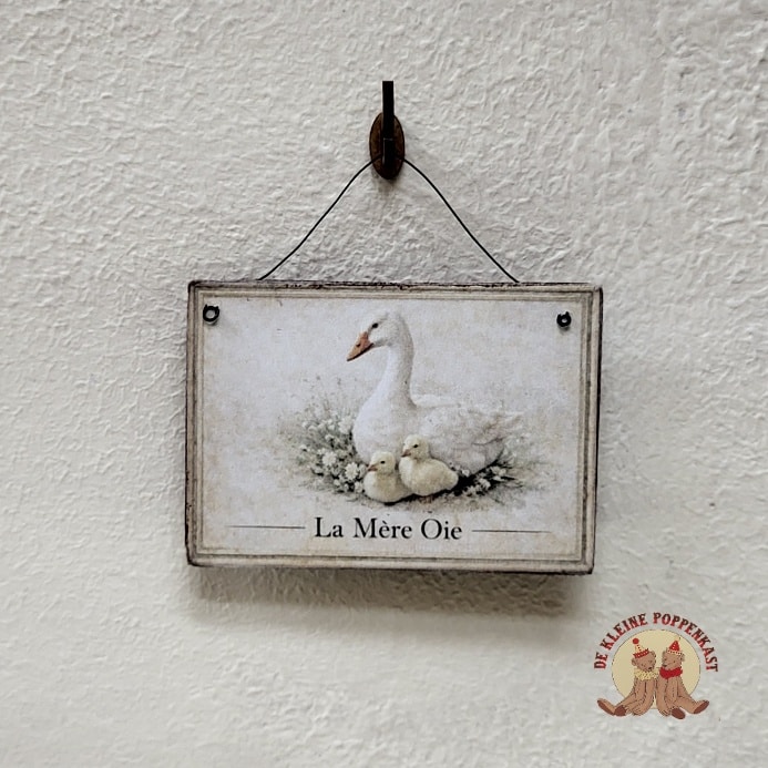 Een lief miniatuurschilderij met een gans en kuikens. De afbeelding geeft een warme, landelijke uitstraling en past mooi in een keuken, hal of kinderkamer van het poppenhuis