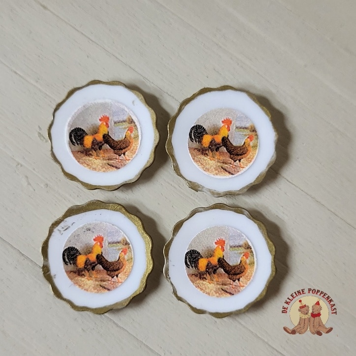 Set van vier miniatuurbordjes met een afbeelding van een haan en een kip. Voor een landelijke uitstraling, maar ook leuk voor pasen.