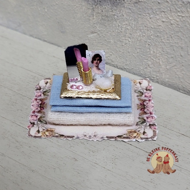 Een schattig miniatuur tableautje in goudkleur. Op twee gevouwen doekjes staan onder andere een roze lippenstift, poederdons en een klein spiegeltje. Dit fijne tafereeltje brengt direct een elegante, vintage sfeer.